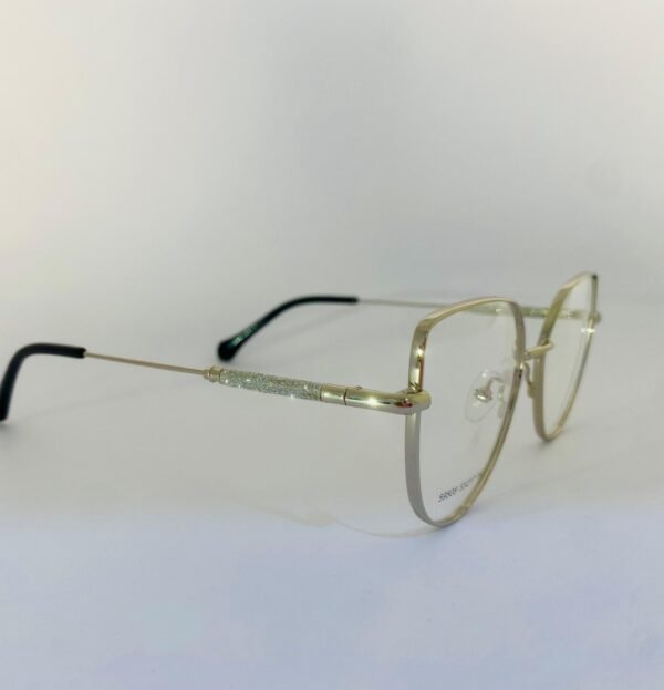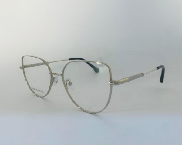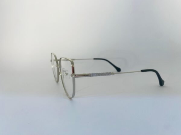 A armação Helena Glam Light combina o prata clássico com um brilho sutil nas hastes, criando um visual leve e feminino.