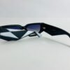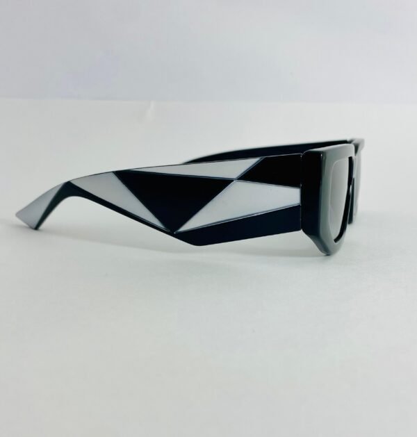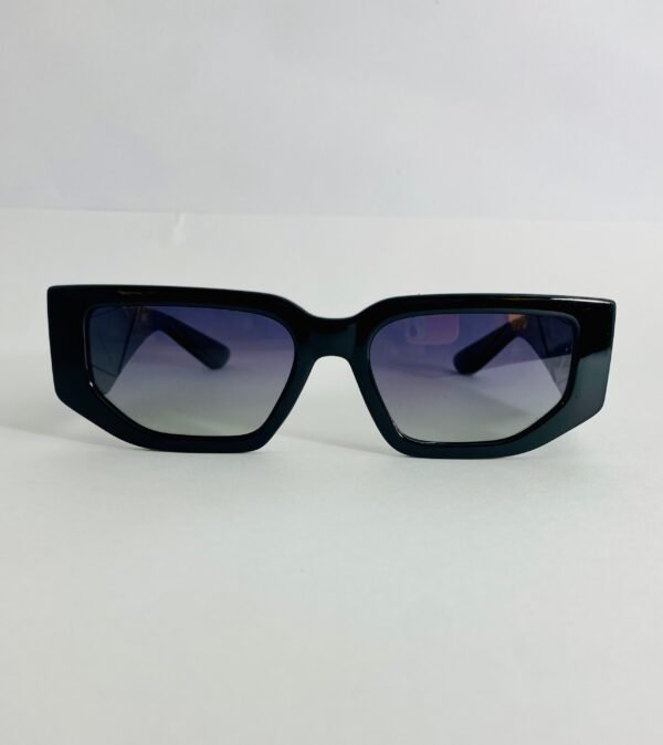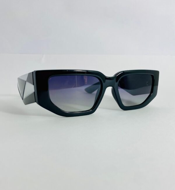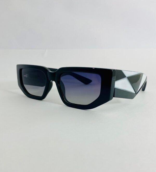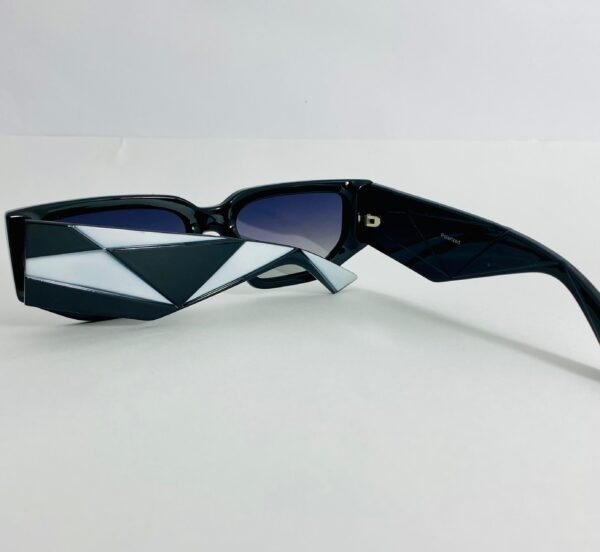 Com design retangular moderno e linhas bem definidas, sua armação preta traz imponência e elegância, enquanto as hastes com acabamento geométrico criam um visual exclusivo e diferenciado.